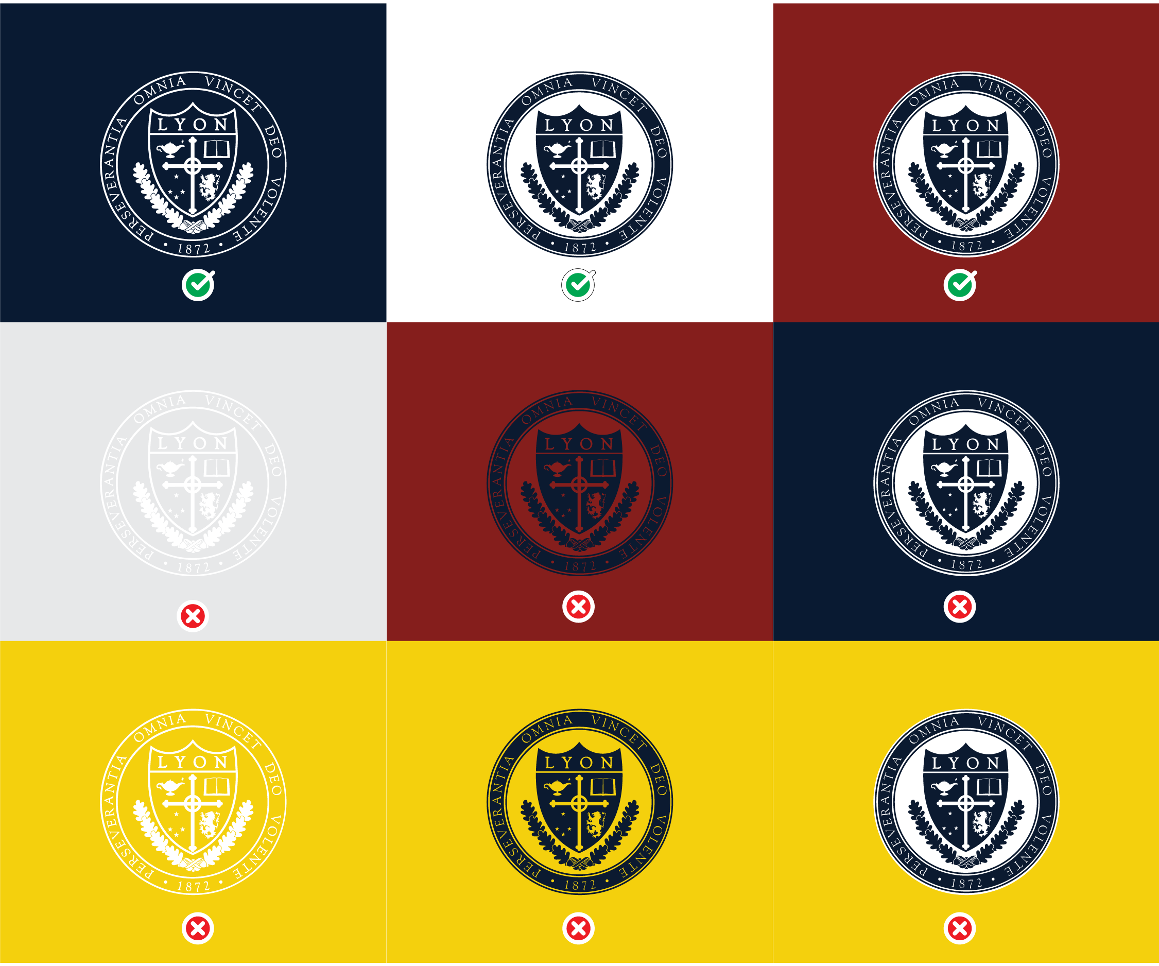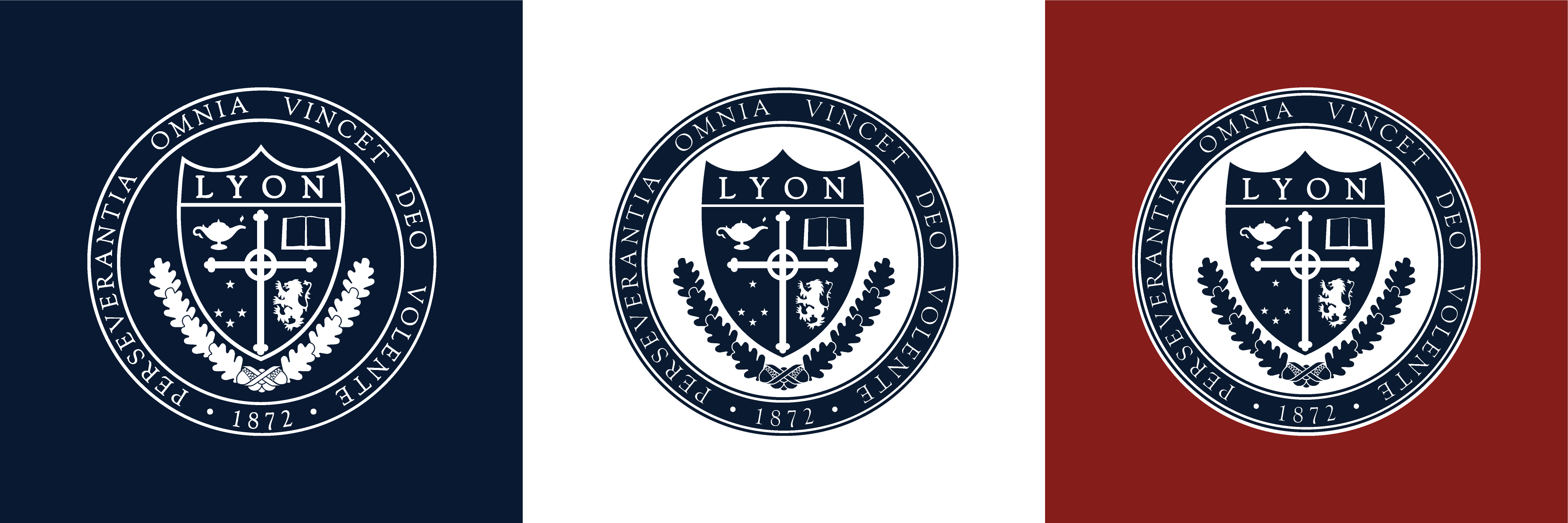 On backgrounds of medium/dark value, you may print in Lyon Crimson with white trim, Lyon Navy with white trim or reverse to white, depending on the contrast. Again, the goal is to make sure the Lyon Brand Mark stands out.