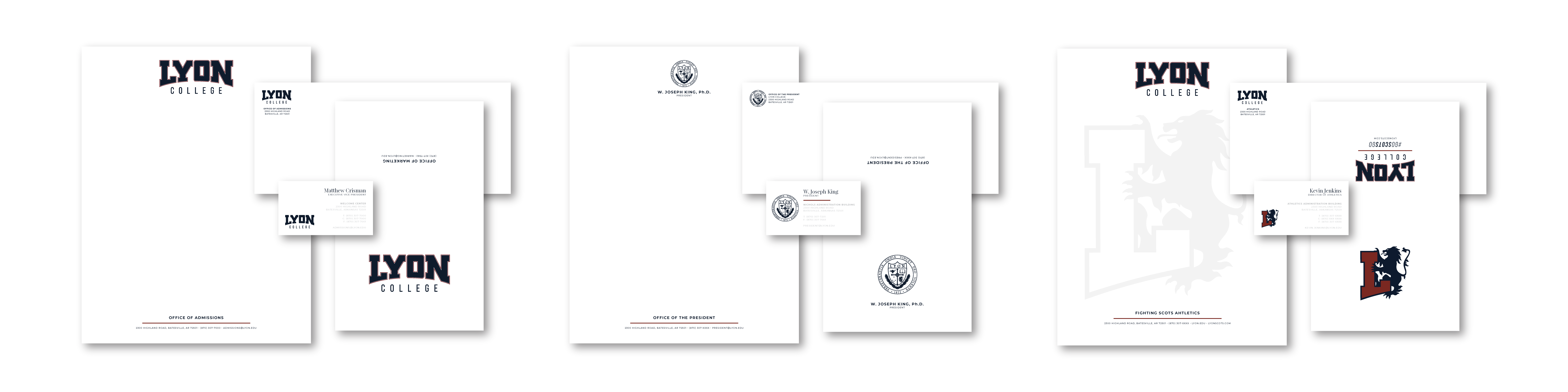 Three versions of the College stationery are available, depending on the department in which you work: Administrative/Academic, President's Office, and Athletics. College letterhead, notecards, envelopes, and business cardsare available through the College's printshop. To order some for your department, please email printshop@lyon.edu. Digital versions of college letterheadare available for download in the Brand Toolbox.
